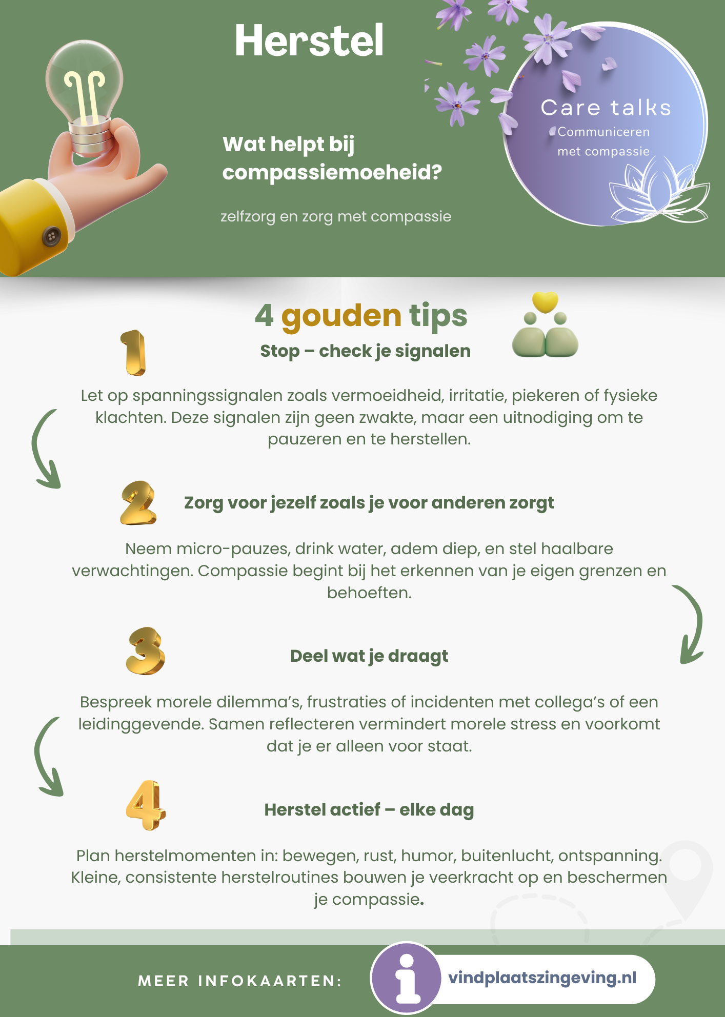 Werken in de zorg vraagt veel van je – emotioneel, fysiek, moreel en professioneel. Om met compassie te kunnen blijven zorgen, heb je zelf zorg en herstel nodig.